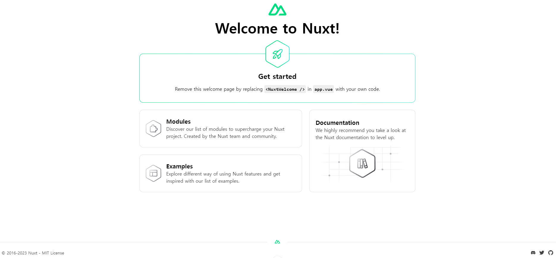 <NuxtWelcome> 컴포넌트를 삭제하고, 다른 태그를 작성하면 화면이 수정된 것을 볼 수 있다.