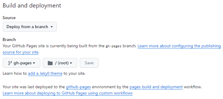 깃 레포지토리 - Settings - Pages에서 Branch가 gh-pages로 되어있는지 확인한다.