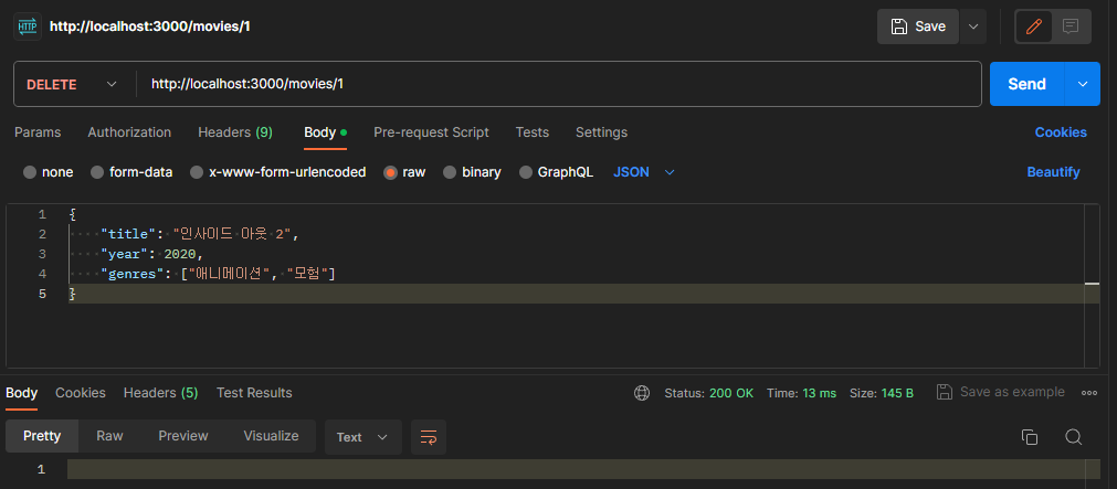 /movies/:id 경로의 DELETE 요청에 대한 응답을 반환한다.