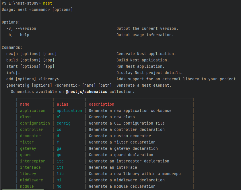 터미널에서 nest 명령어를 실행하면 nest에서 사용할 수 있는 명령어 리스트를 확인할 수 있다.