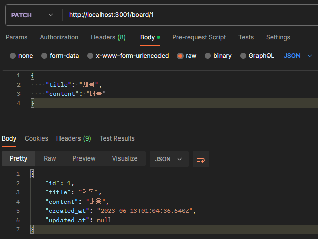 - patch() 안에 전송할 데이터의 key와 value를 작성한다. (title, content, updated_at)