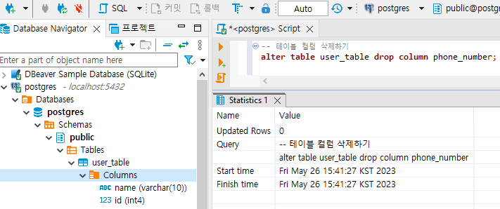 | [PostgreSQL] 테이블 컬럼 생성, 수정, 삭제하기(column) (0) | 2023.05.26 |