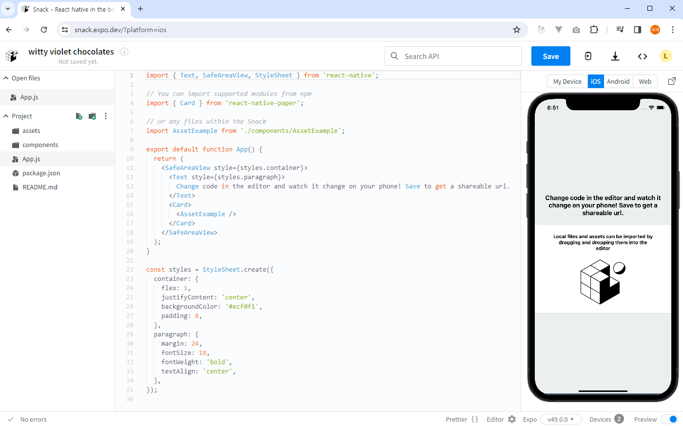 어떠한 설치 없이 중앙 편집기에서 코드를 작성하면 우측에서 IOS, Android, Web의 결과 화면을 확인할 수 있다.